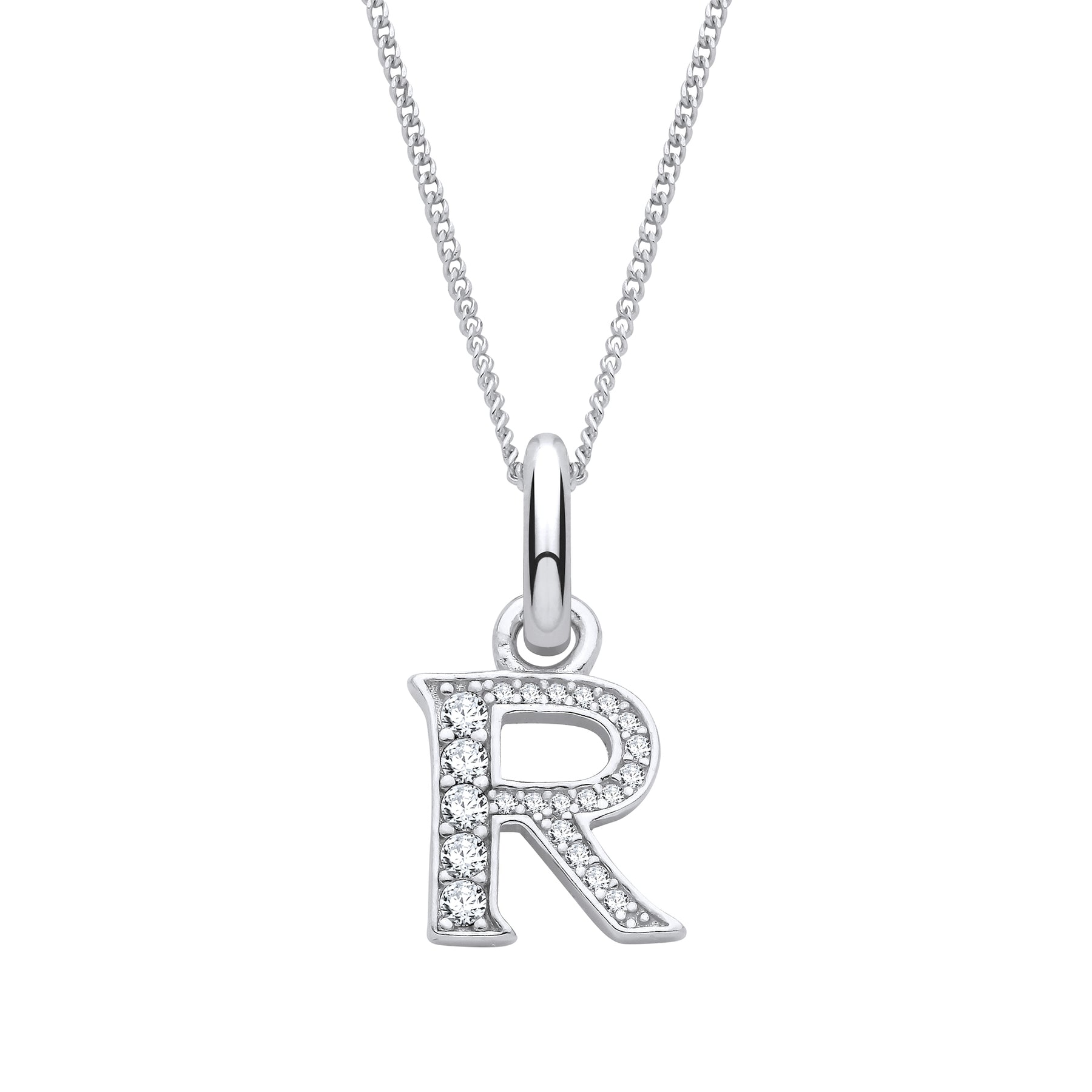 Make a refined statement with this sterling silver letter R pendant, embellished with shimmering cubic zirconia for added prestige and allure. The piece hangs gracefully from a slender 1mm sterling silver curb chain, creating an elegant silhouette that works beautifully on its own or as part of a curated layered look. Crafted with precision and attention to detail, this initial pendant appeals to those who appreciate personalised jewellery with a touch of sparkle. A versatile choice for everyday wear or special occasions, it brings timeless sophistication to any collection.