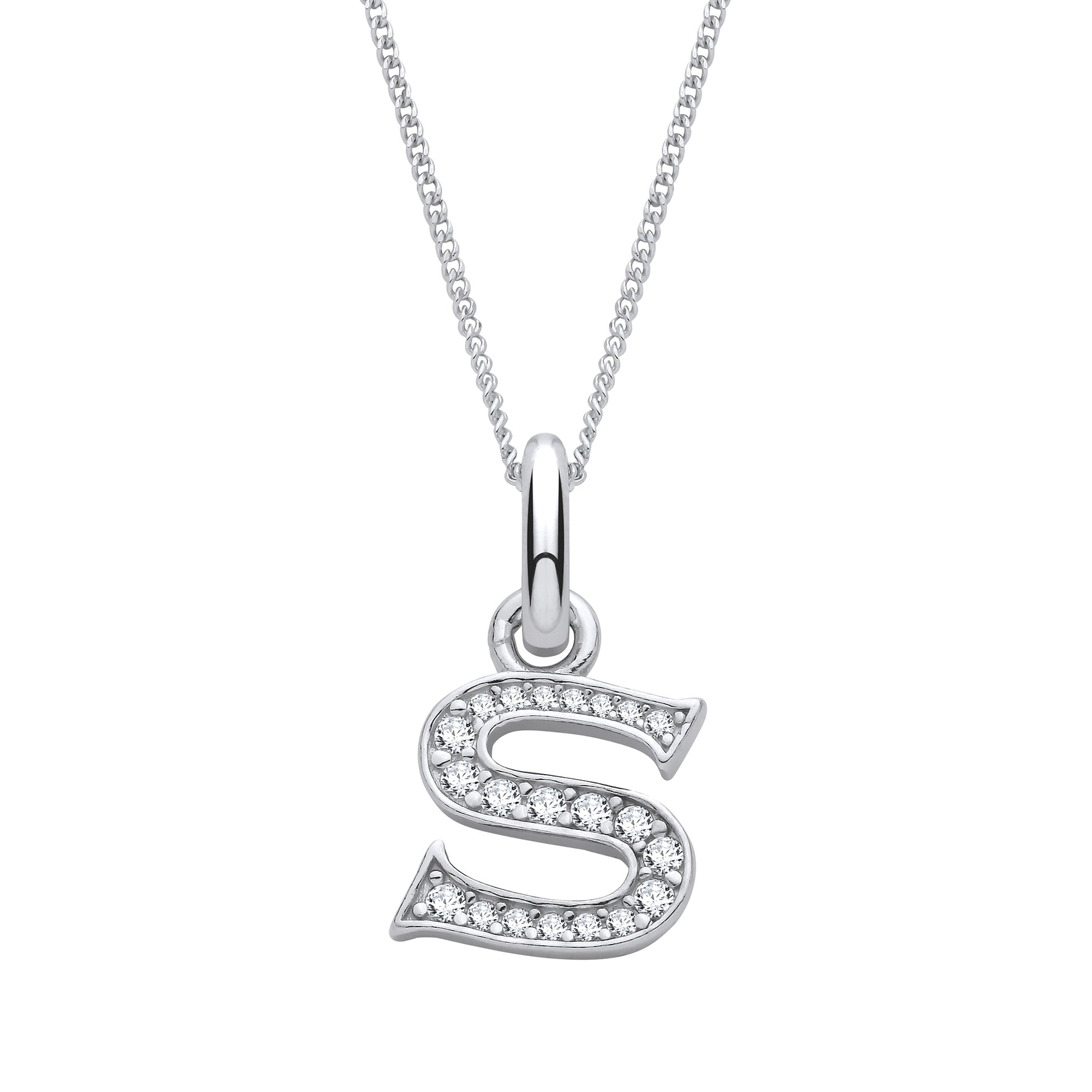 Sterling Silver & Cubic Zirconia Letter S with a 1mm Sterling Silver Curb Chain